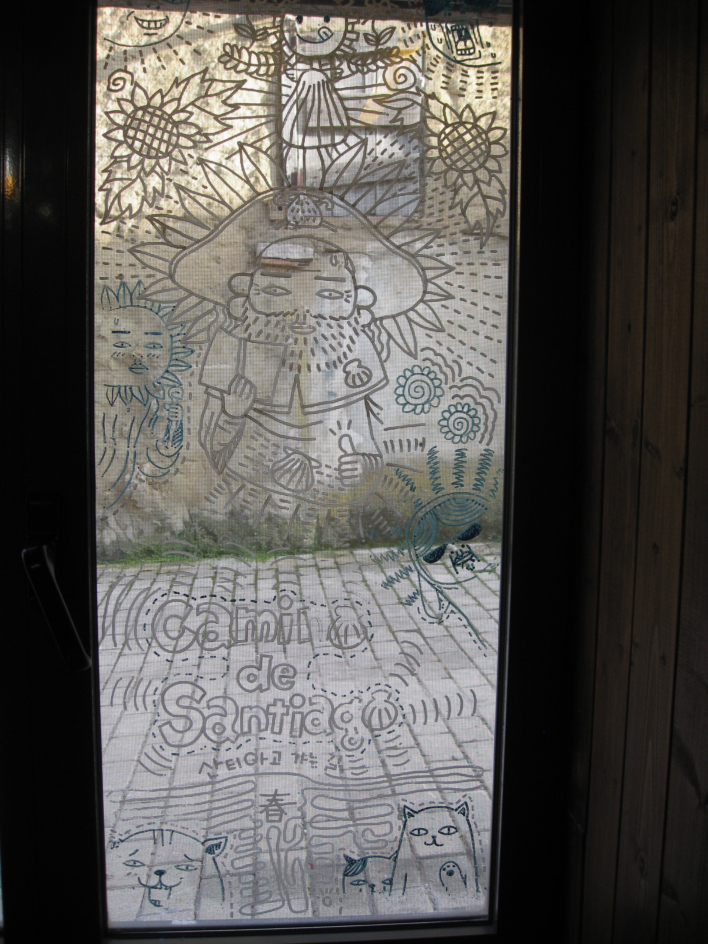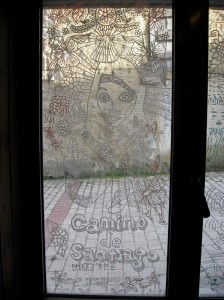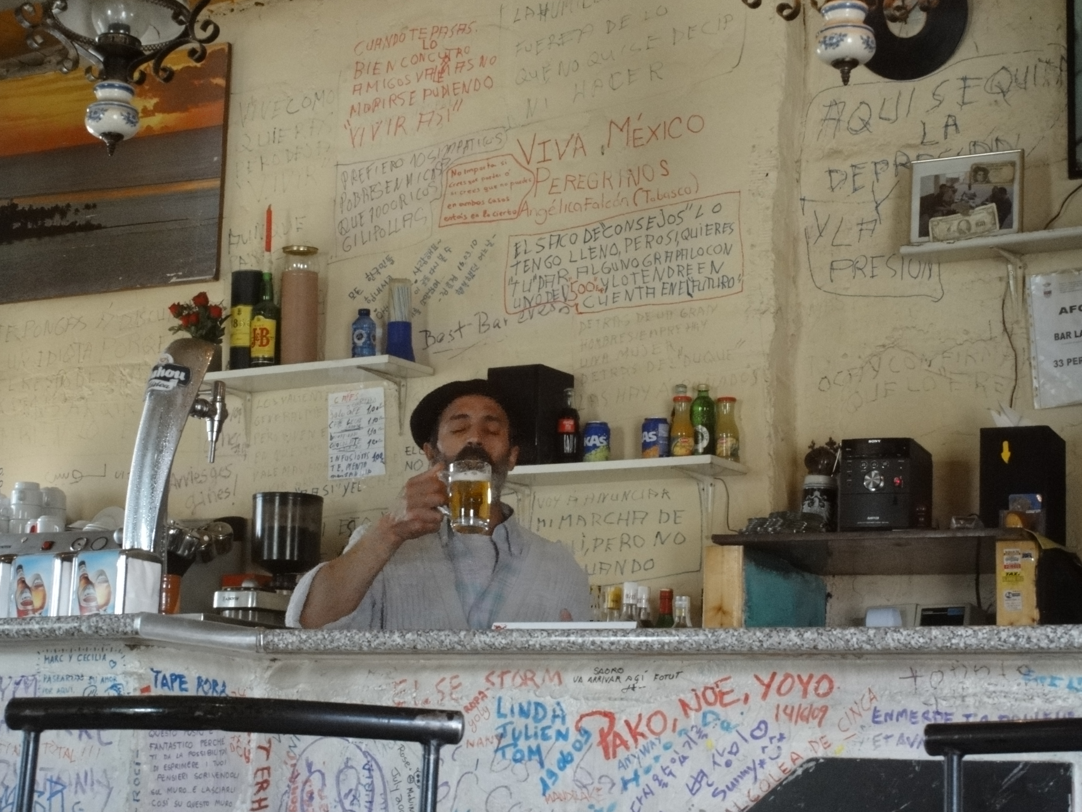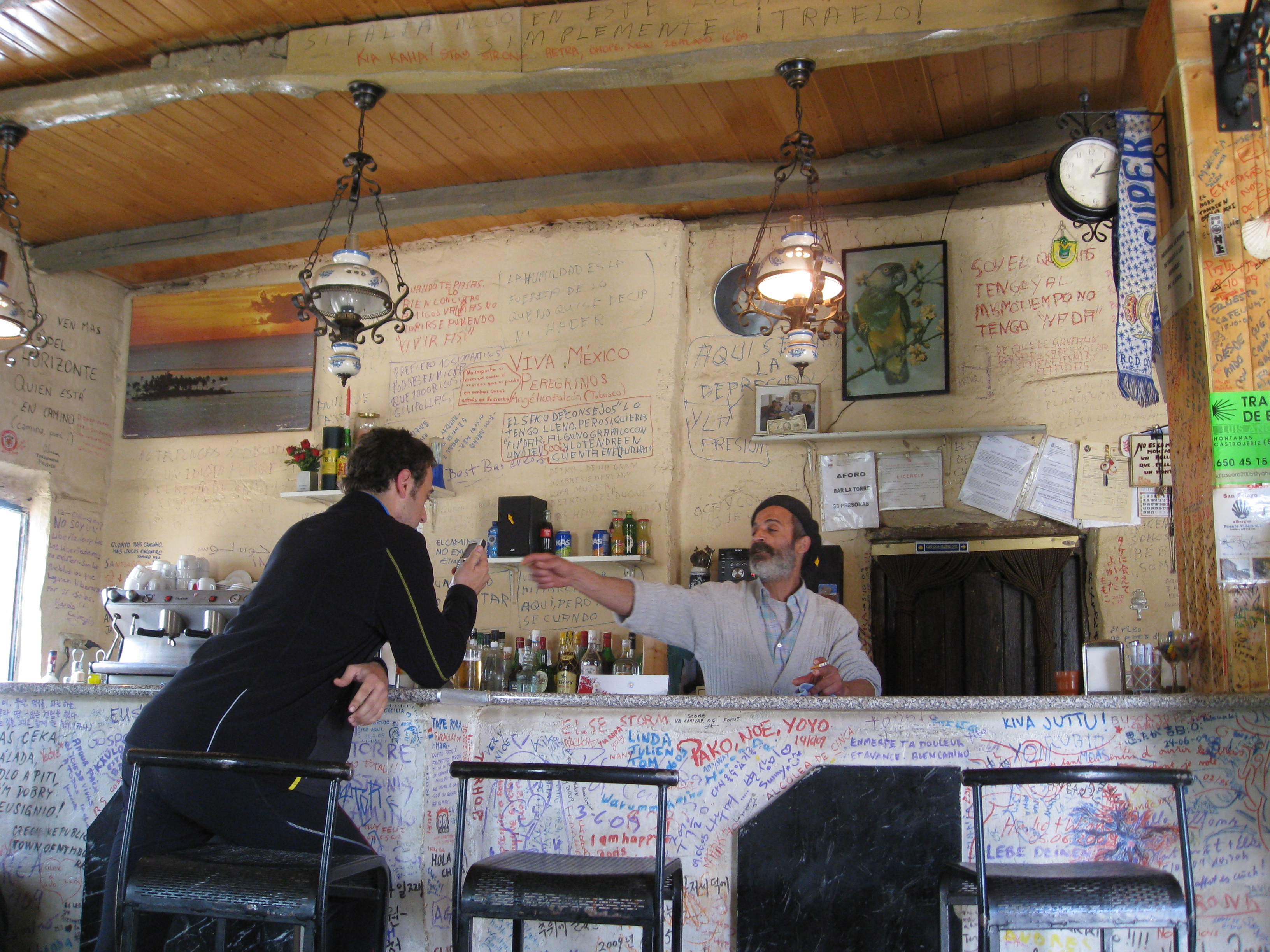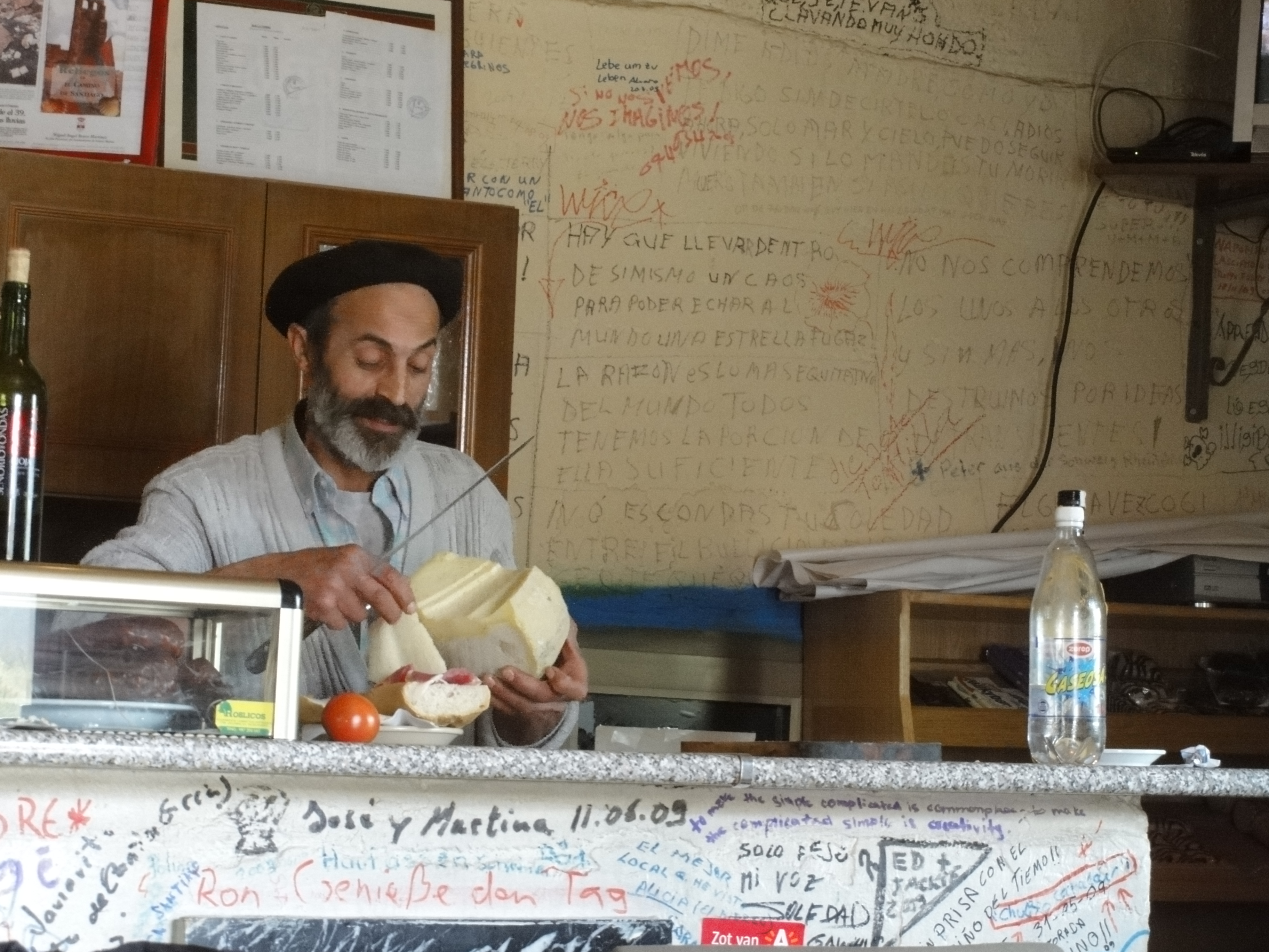 Another hidden gem along the way to León was a little cafe/bar/resturant that we happened upon for lunch, in a tiny village we almost didn’t even stop in. The bar was illustrated, inside and out, with messages from fellow pilgrims: words of wisdom, philosophical self-discoveries and “I was heres”. The bartender was what really made it though. He looked somewhat French with his little black beret, but his actions spoke differently. Grooving around, serving drinks, making sandwiches, all while talking and laughing with customers and stopping every so often for a cigarette and a beer. He certainly proved to us that you can enjoy your job, it’s just a matter of attitude. Being able to drink while working helps too.